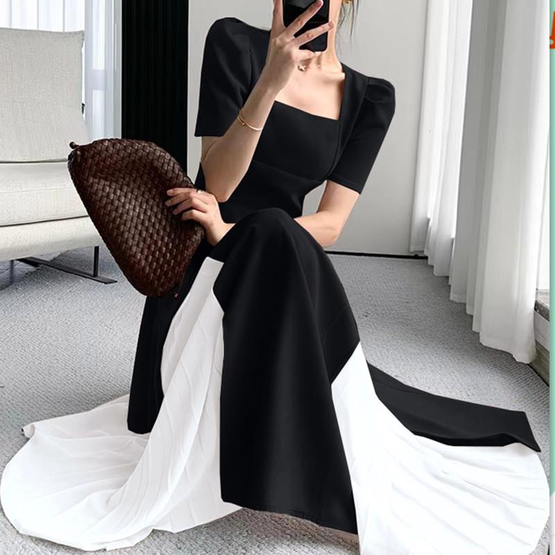 Tags : black gray dress, chiffon short sleeve dress, french style dress, plus size dress, slim fit dress, square collar dress,