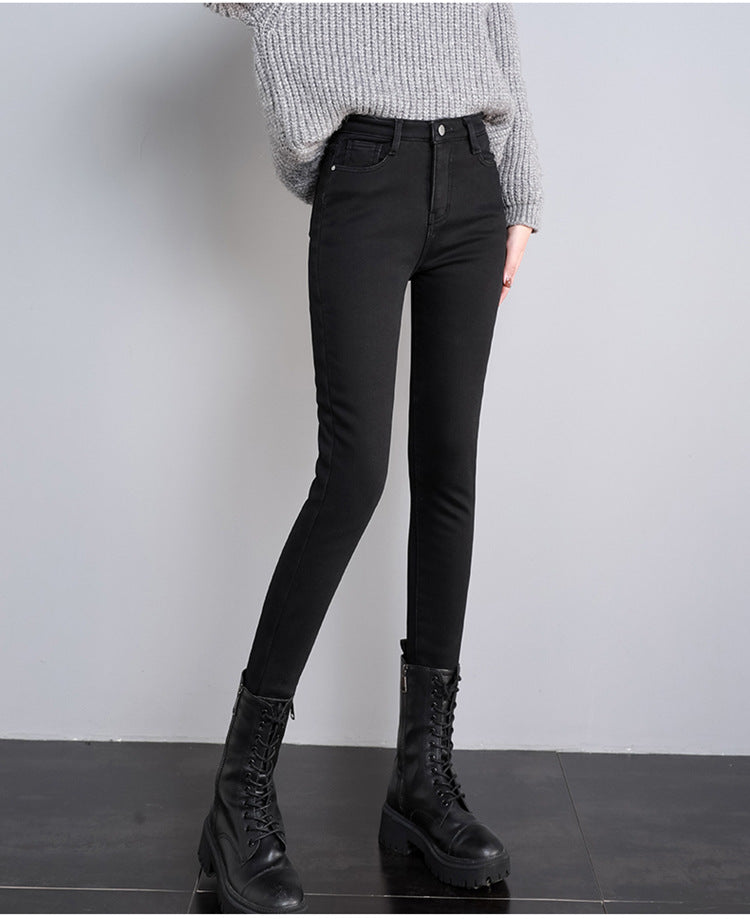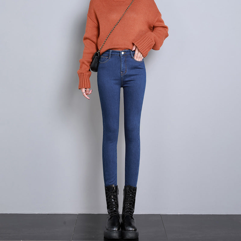 High Waist Velvet Thickening Denim Female Stretch Feet Pants