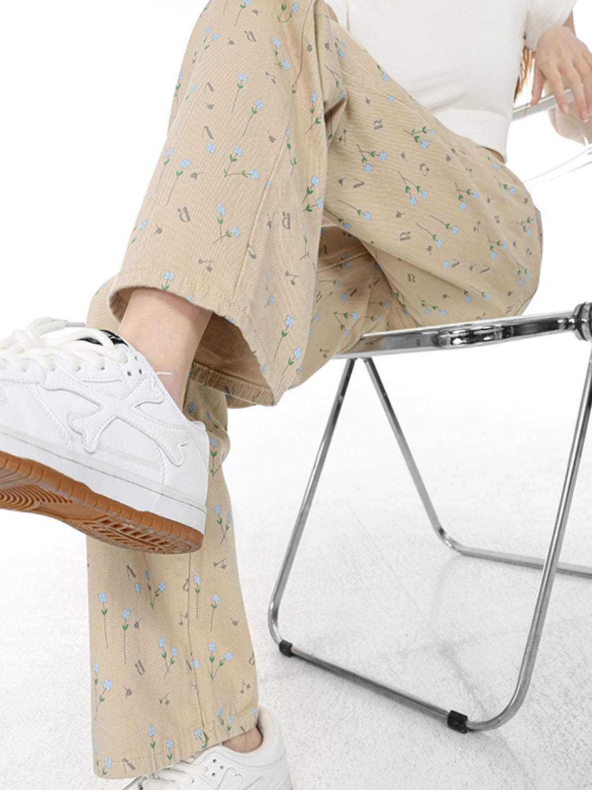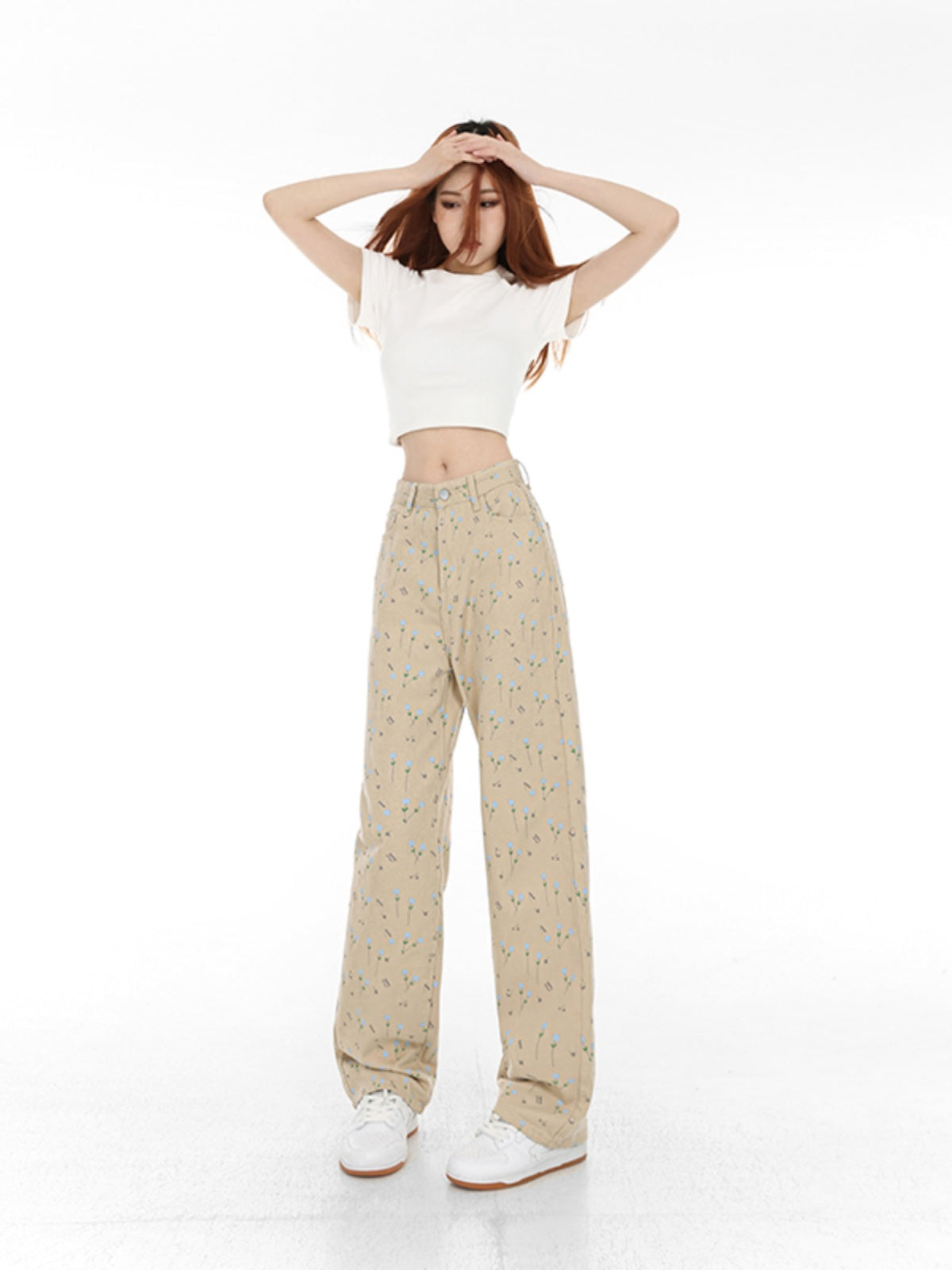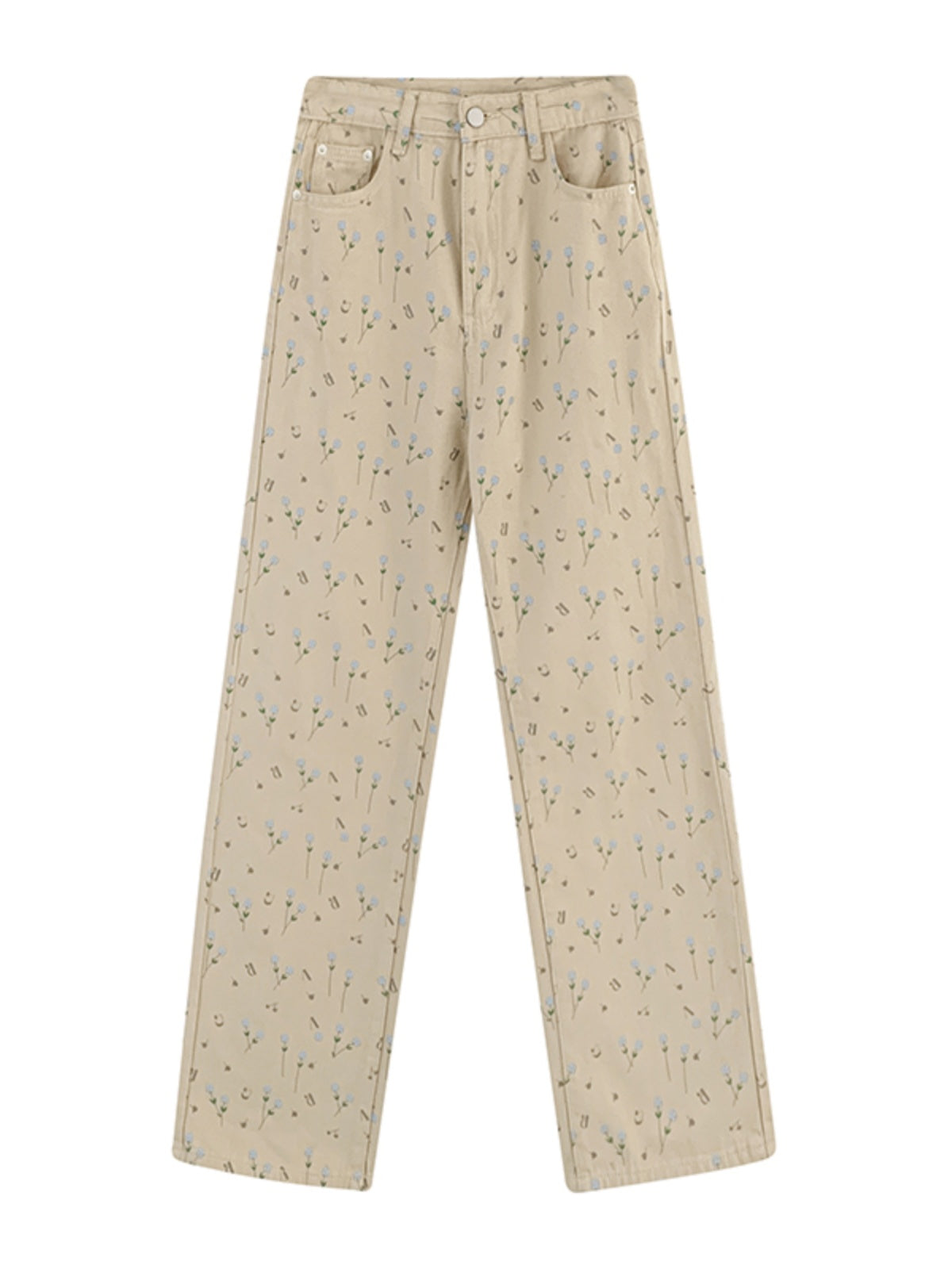 Tags : apricot wide-leg pants, asian size denim, cotton elastic denim, floral jeans for women, light color denim, women's straight leg jeans,