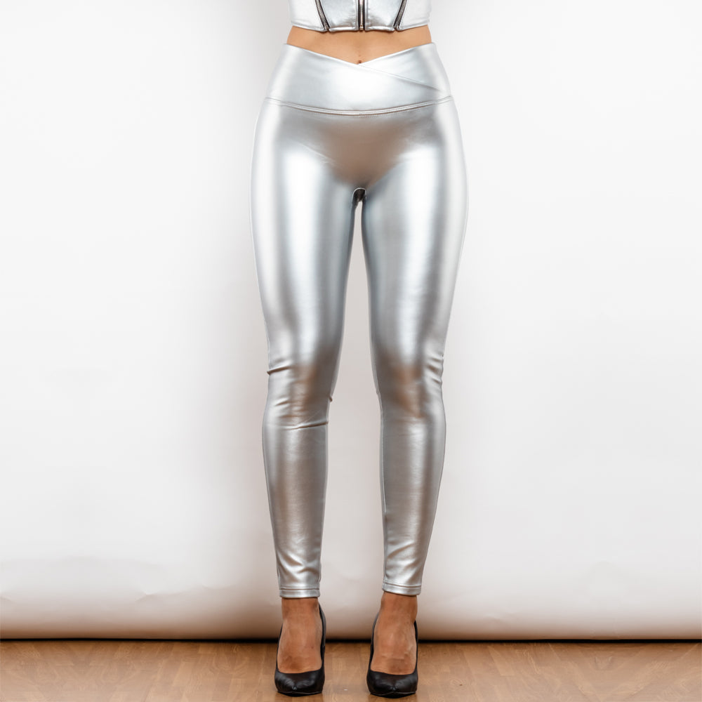 Shascullfites Melody X Cross Silver High Waist Leather V Shape Leggings Metallic Leggings Sexy Woman Clothing