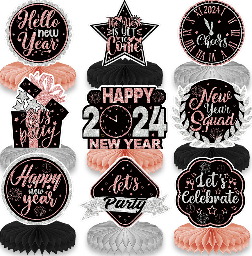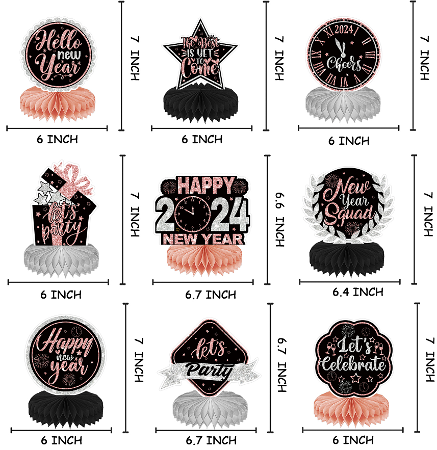 Size: 9 black gold new year honeycomb ornaments, 9 rose gold new year ornaments