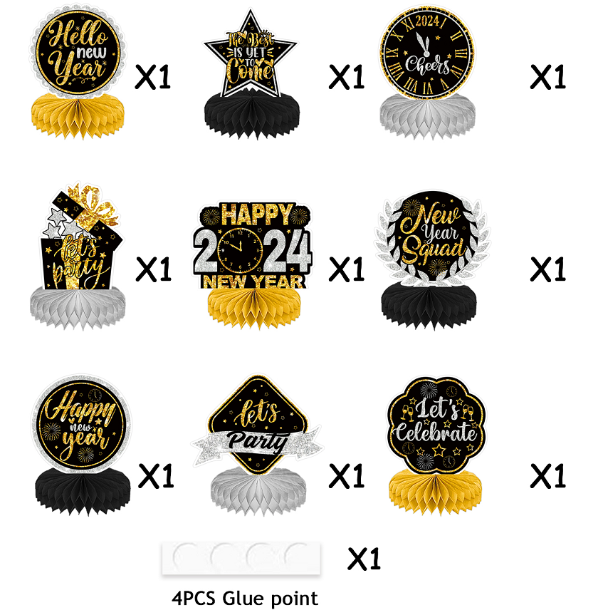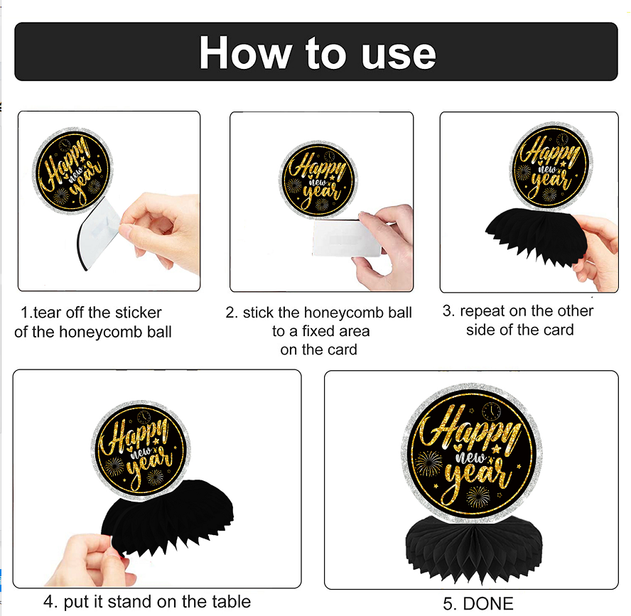9 New Year cards (HD double-sided printing) Nine 360 degree honeycomb balls 1 explanatory card 1 spare dispenser