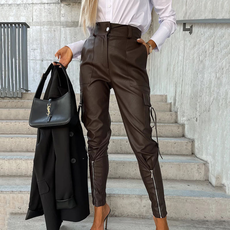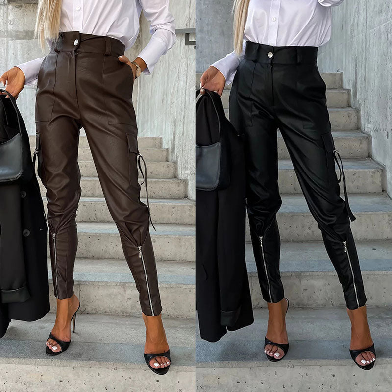 23 Years Fall Winter Fashion Slim PU Leather Waist Skinny Trousers With Pockets