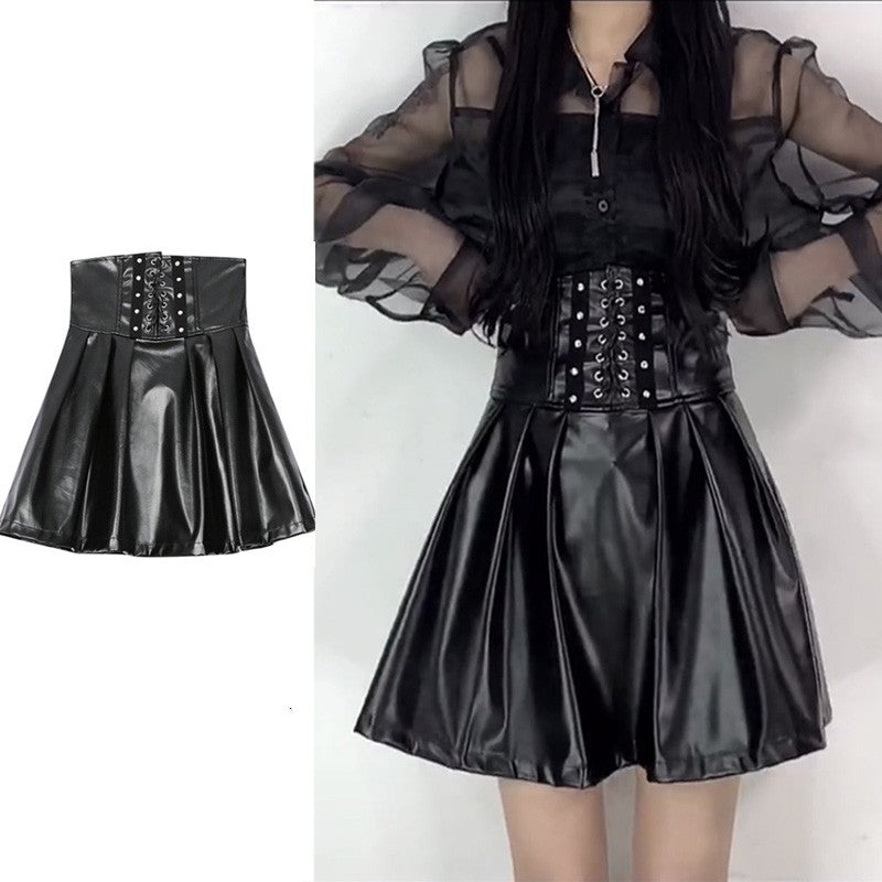 Black High Waist Small Leather Skirt Women's Cinched Pleated Split Skirt
