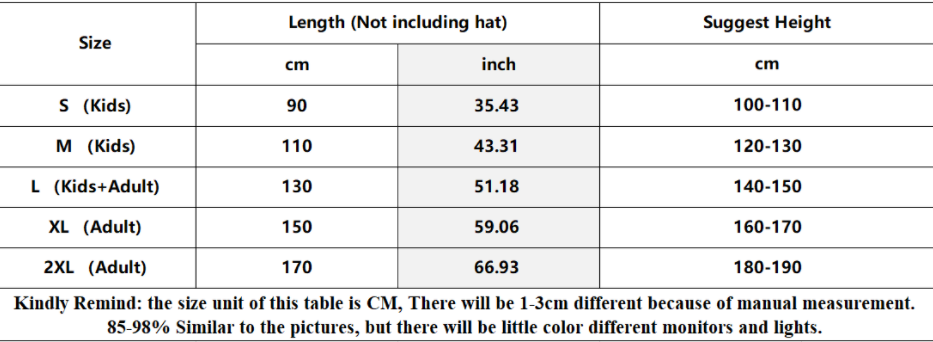 Shoulder to skirt 150cm (thick material), shoulder to skirt 180cm (thick material), shoulder to skirt 130cm (thick material), shoulder to skirt 130cm (thin material), shoulder to skirt 150cm (thin material), shoulder to skirt 180cm (thin material)