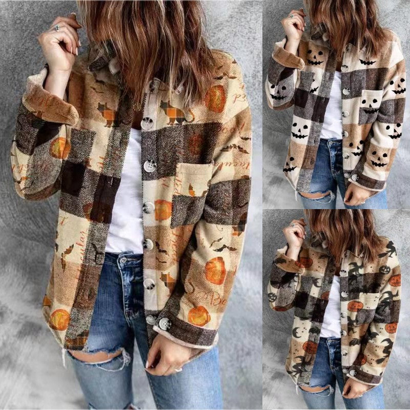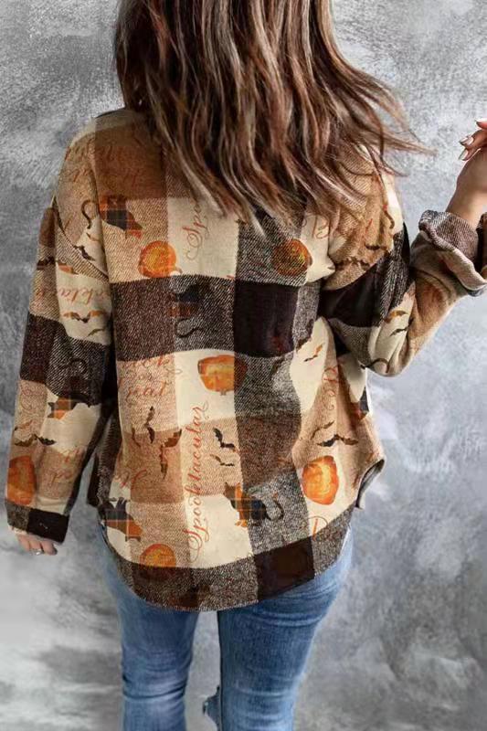 Halloween Check Print Long Sleeve Pocket Blouse