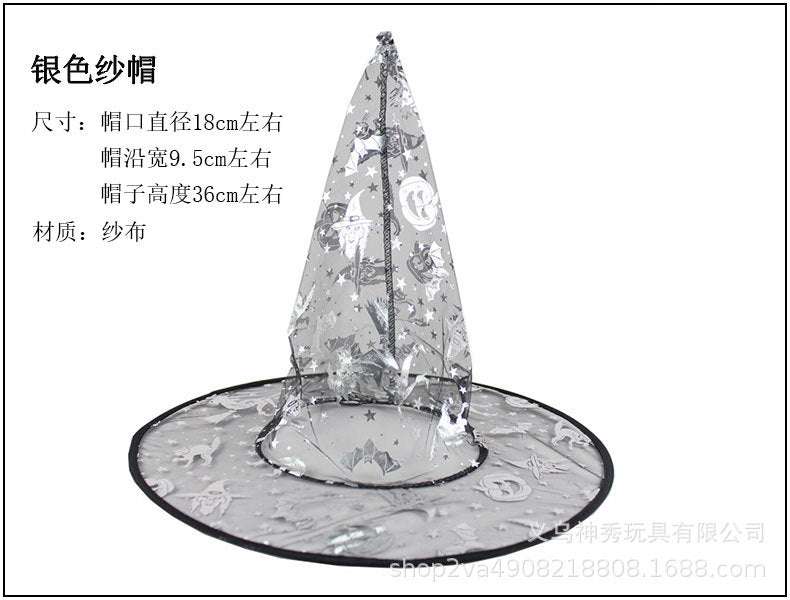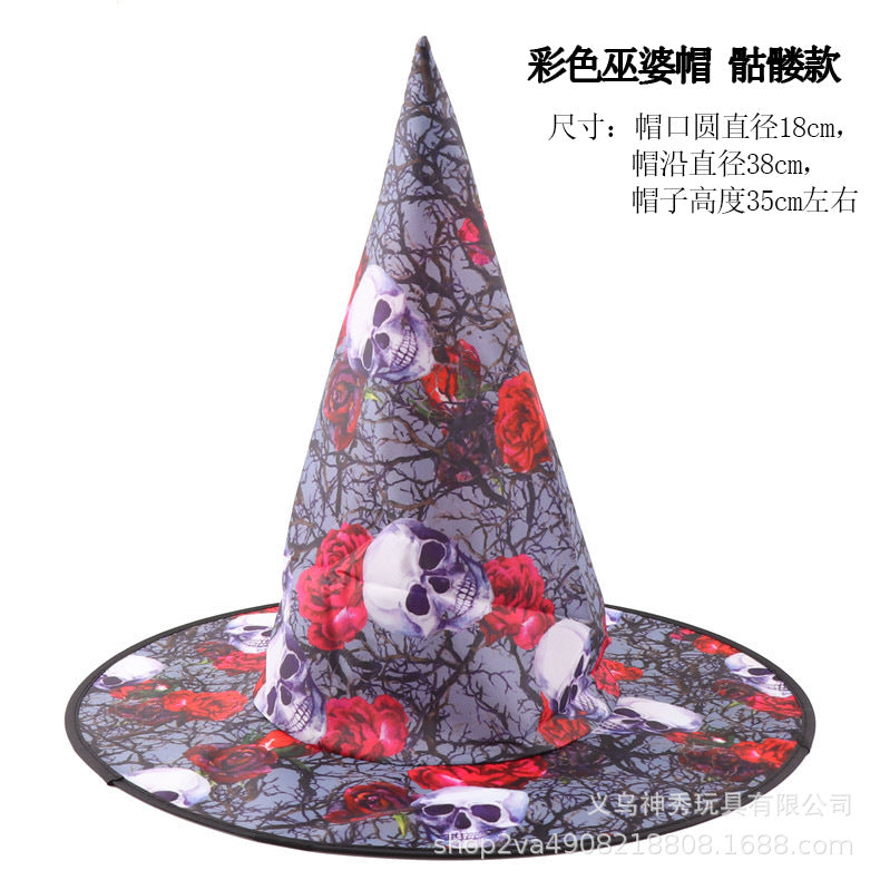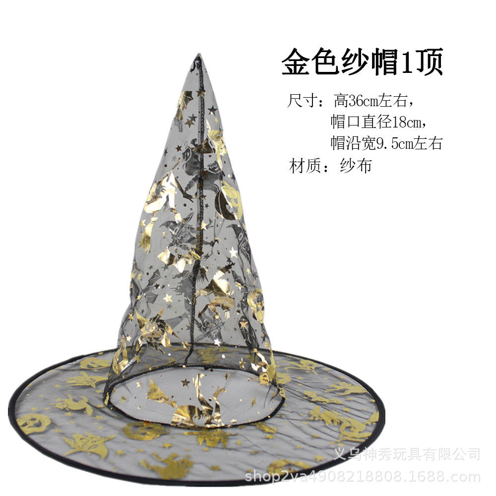 Color: 1 Black Witch Hat, 1 printed pumpkin black witch hat, 1 printed bat Black Witch Hat, 1 printed skull Black Witch Hat, 1 tied witch hat Green, 1 tied witch hat yellow, one lace-up witch hat purple, one lace-up witch hat Rose Red, one buckle witch hat, one gauze cap gold, one gauze cap silver, one black curved witch hat, one star and moon pattern curved witch hat, one curved witch hat, one flocking witch hat purple, one flocking witch hat red, one flocking witch hat orange, one colored witch hat orange pumpkin, one colored witch hat orange kid, one colored witch hat skull, one colored witch hat purple bat, one colored witch hat purple witch, one veil witch hat red, one veil witch hat purple, and one veil witch hat orange