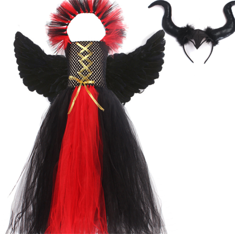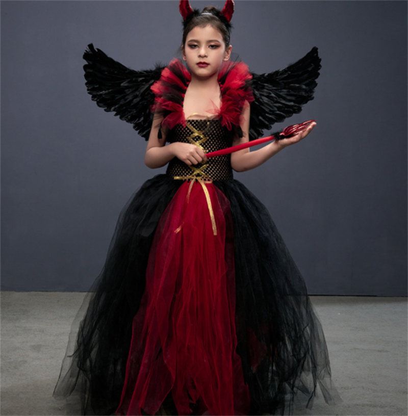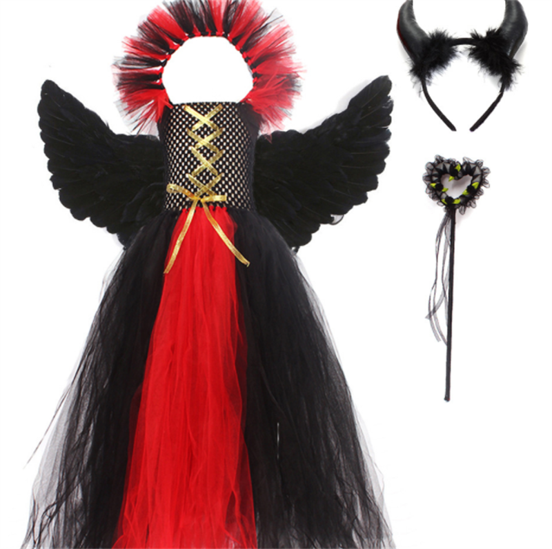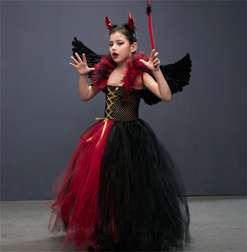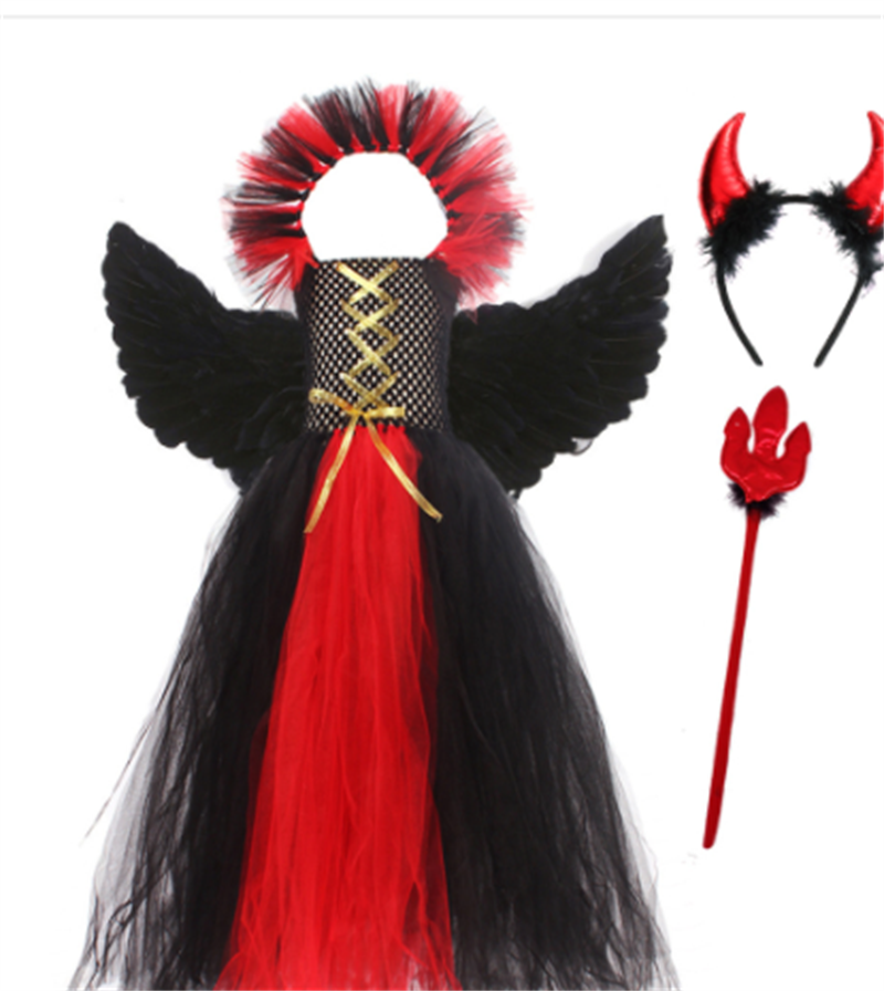 Tags : asian size kids clothing, children's nylon polyester suit, girls skirt set with accessories, gothic little devil costume, halloween cosplay dress, red black horned outfit,