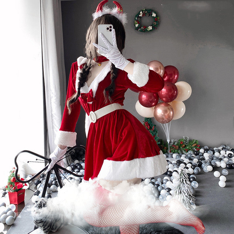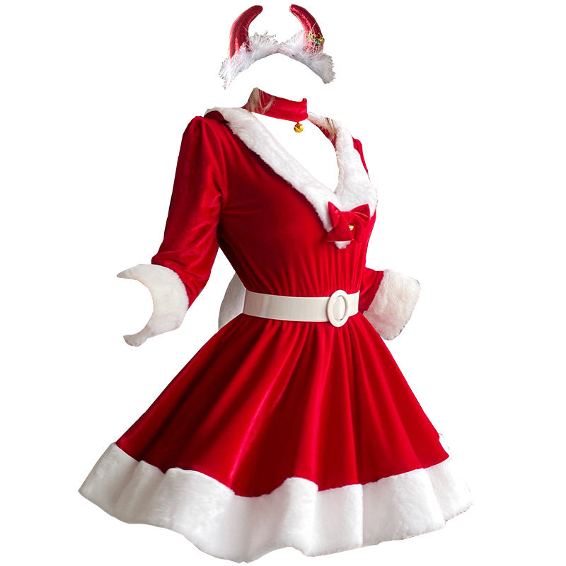 Color: Red 4-piece set [dress + bell necklace + belt + gloves], red 4-piece set + socks, red 4-piece set + socks + hair band