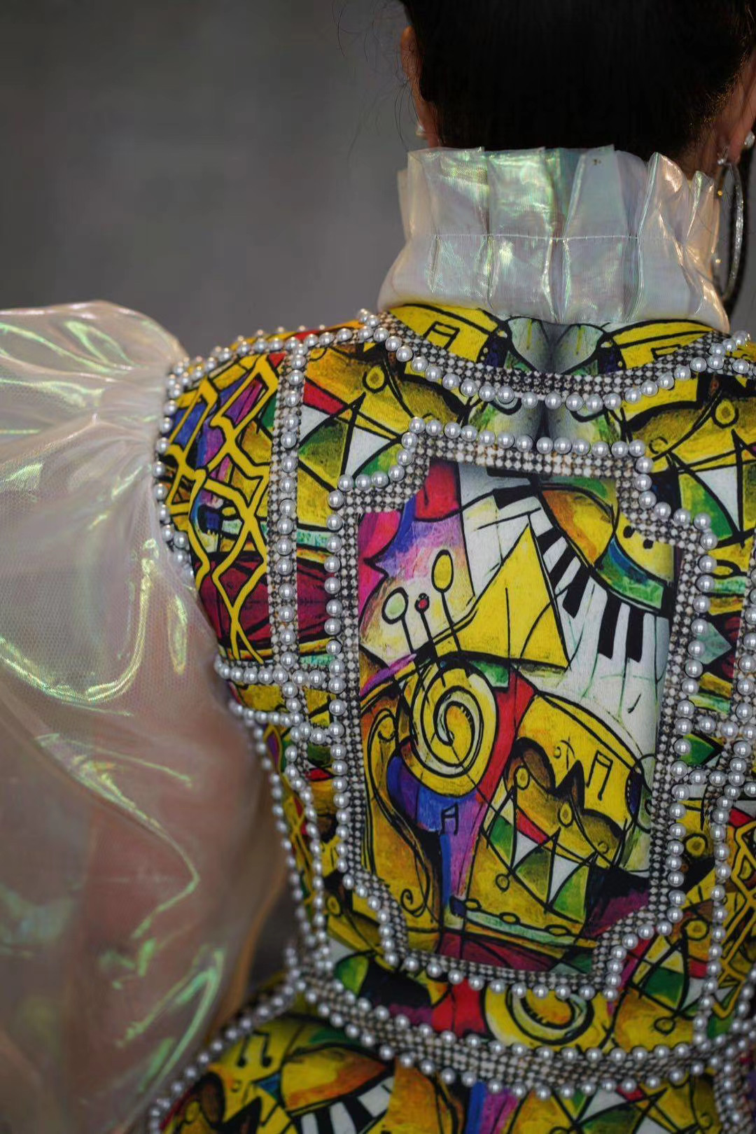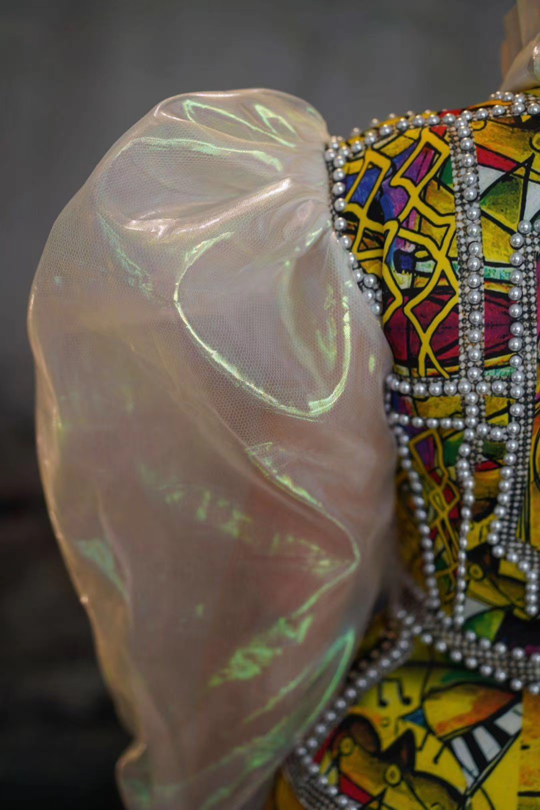 Party Costumes Catwalk Pearl Puff Sleeve Abstract Print One-Piece Female Costumes