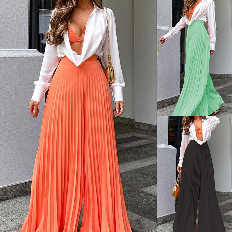Polyester European And American Ladies Fashion Temperament Pleated Long Wide-leg Pants