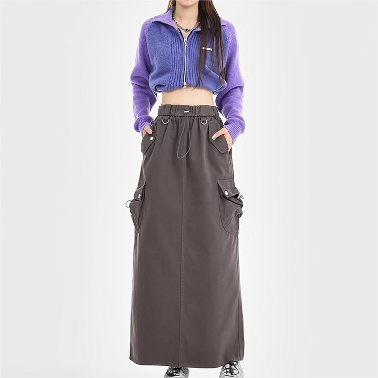 Tags : black mocha lead gray skirt, casual mid-length skirt, cotton a-line skirt, japanese korean style skirt, loose skirt with pockets, retro workwear skirt,