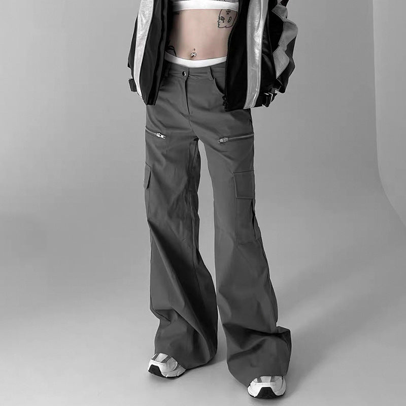 Tags : asian size casual pants, dark gray straight-leg pants, japanese korean casual pants, pocket design casual pants, simple style women's trousers, women's casual polyester pants,