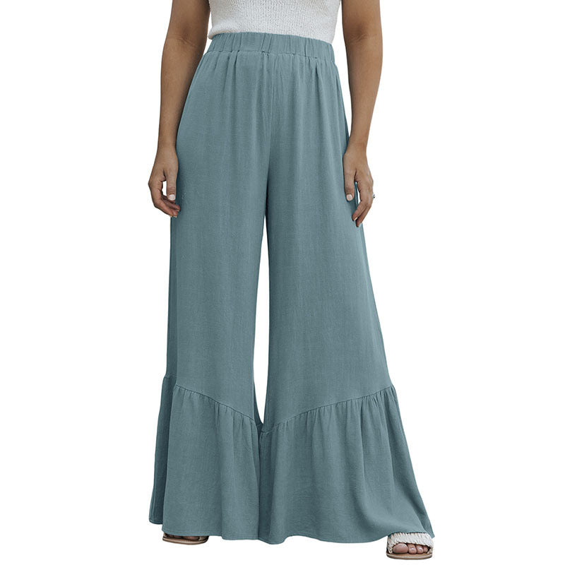 Tags : casual wide leg pants, cotton high waist pants, elastic waist female pants, high waist wide leg pants, solid color women's pants, women's ruffle trousers,