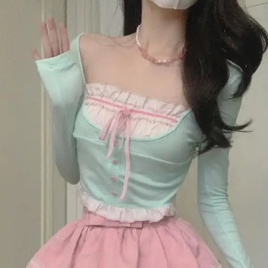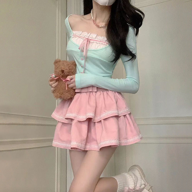 Tags : acrylic two-piece set, asian size women's clothing, long sleeve top skirt, ol commuting style, slimming dress set, spring summer fashion,