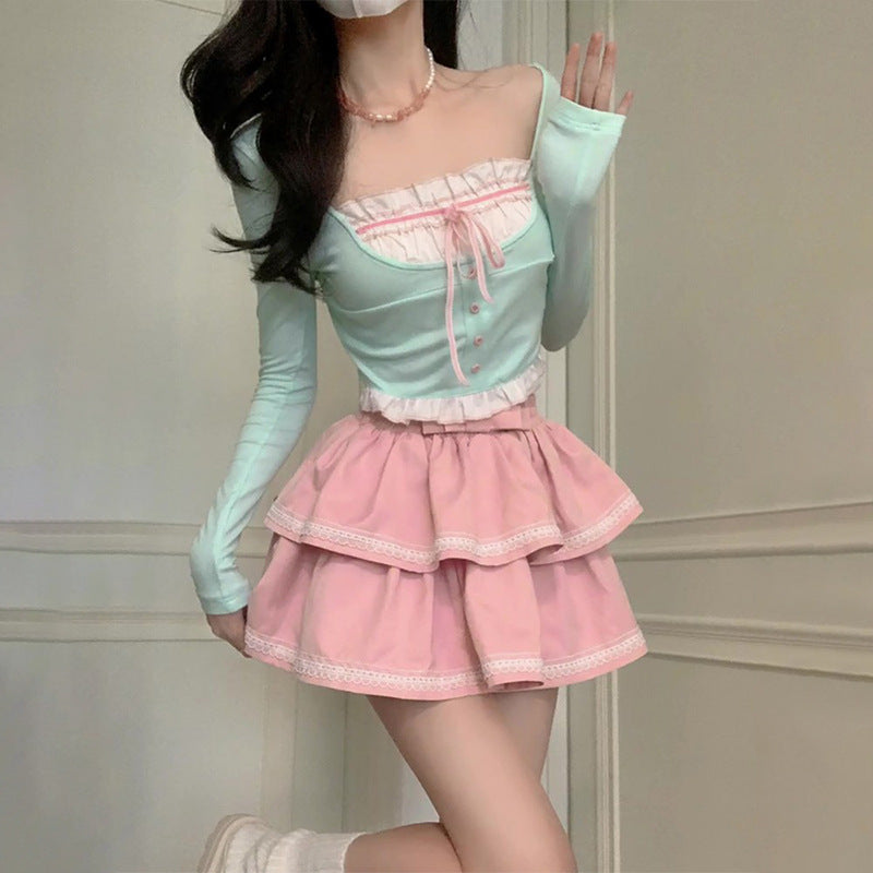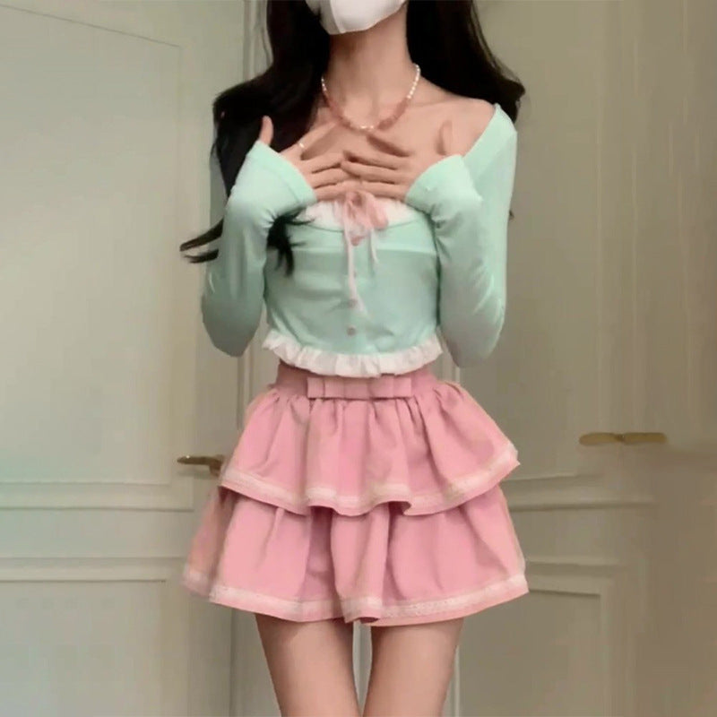 Spring And Summer Vigorous Girl Lace Collar Cardigan Slim Slimming Dress Two-piece Set