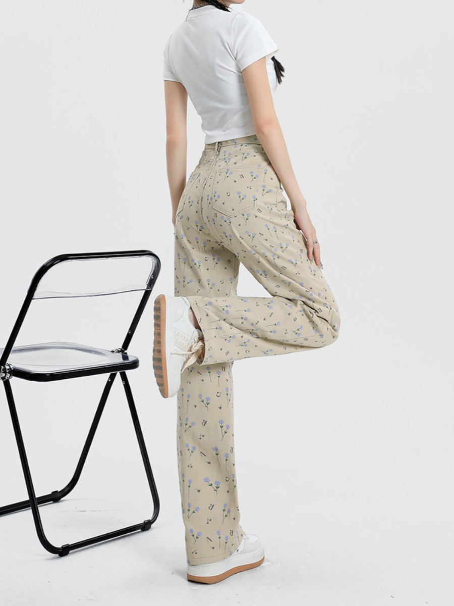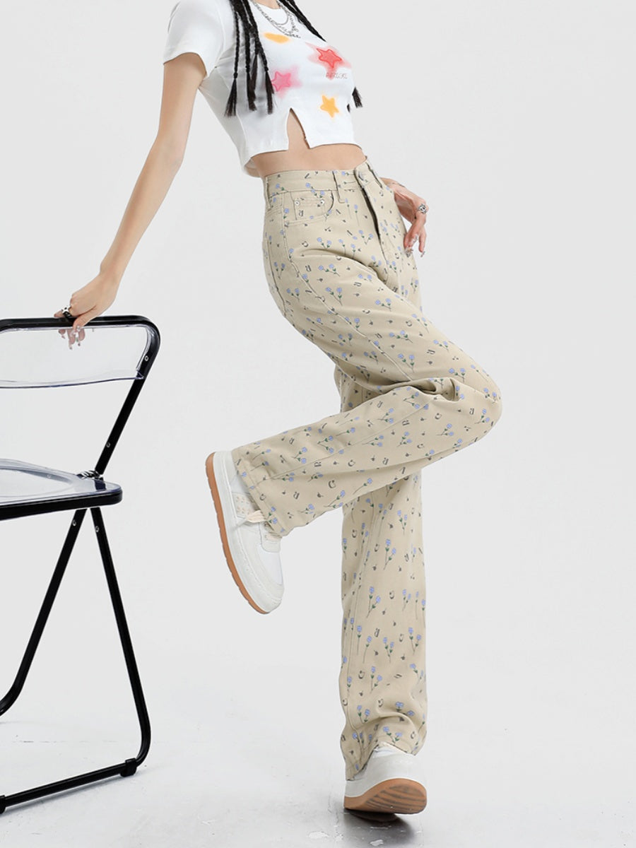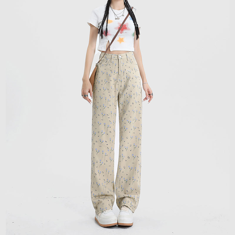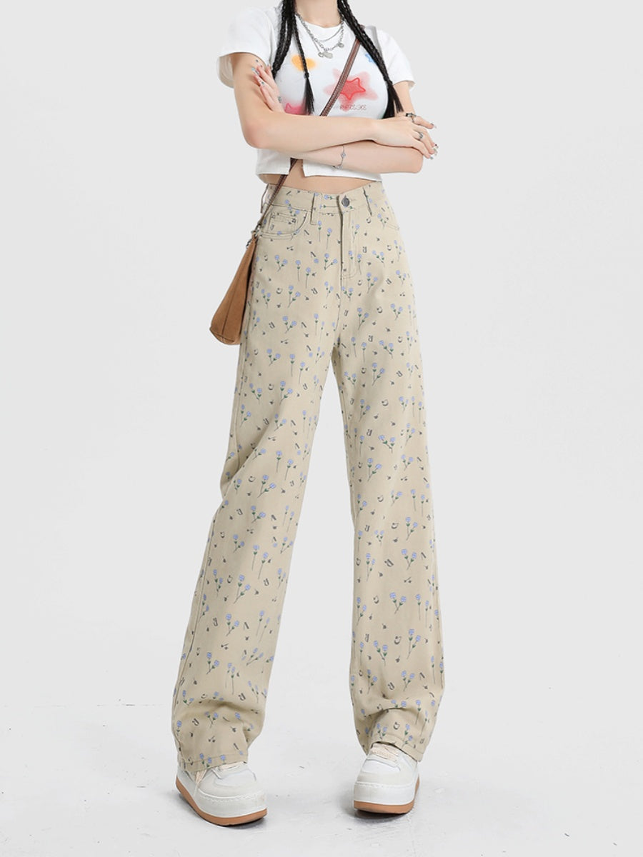 Vintage Floral High Waist Jeans Women's Wide Leg Straight Casual Pants