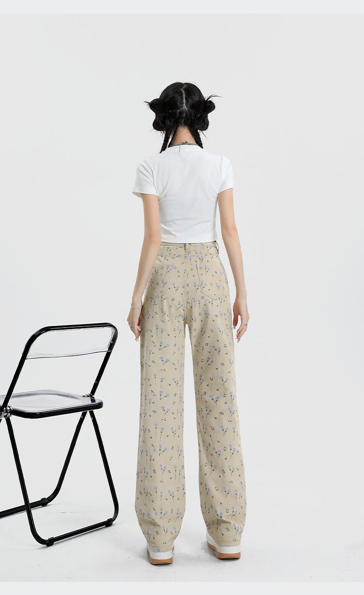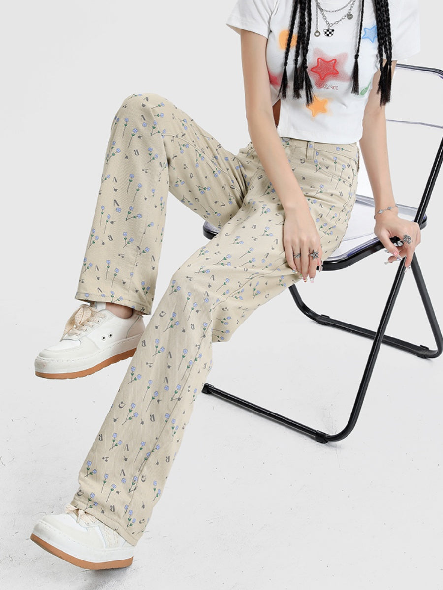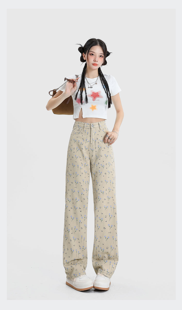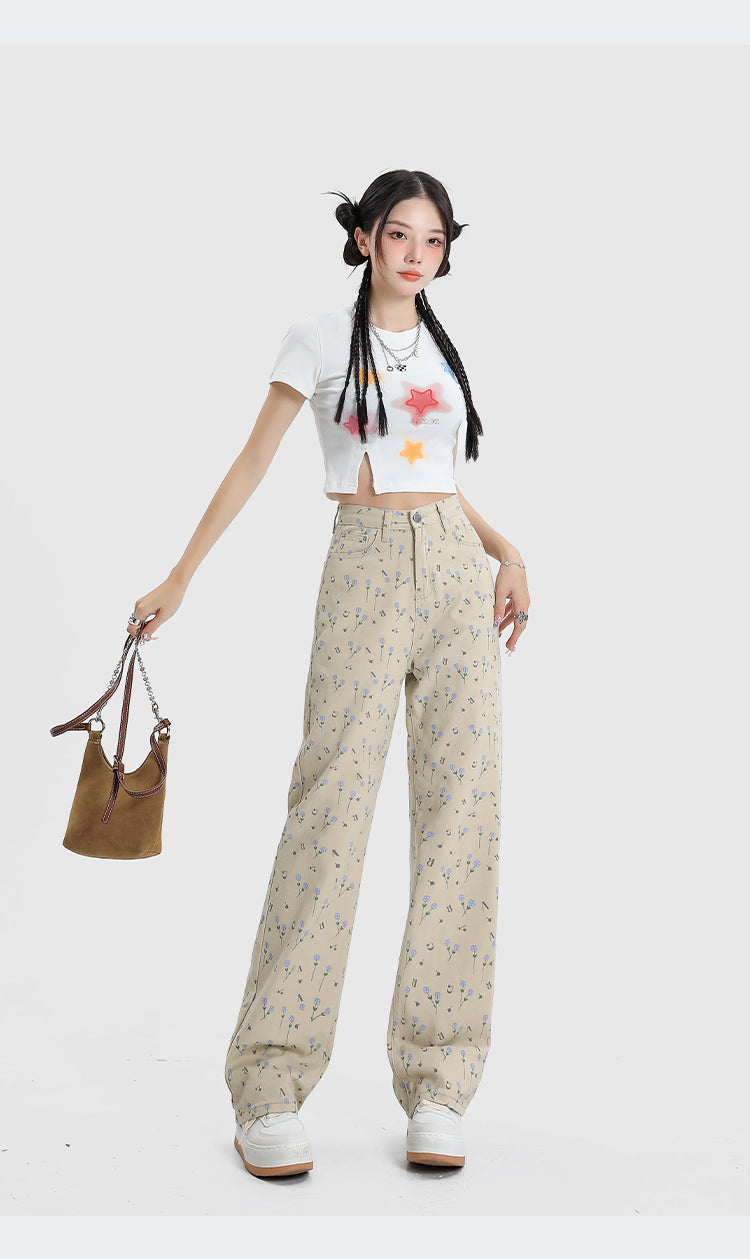 Vintage Floral High Waist Jeans Women's Wide Leg Straight Casual Pants