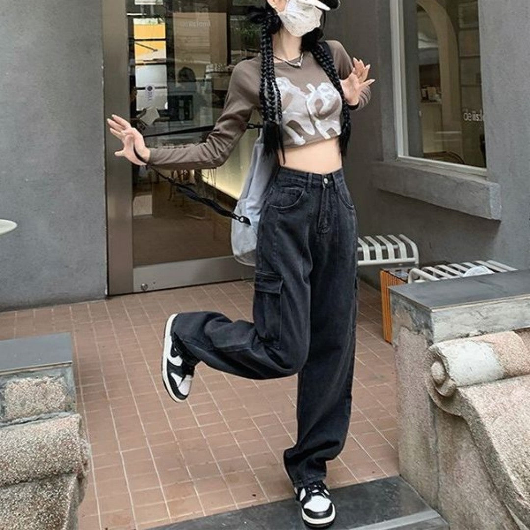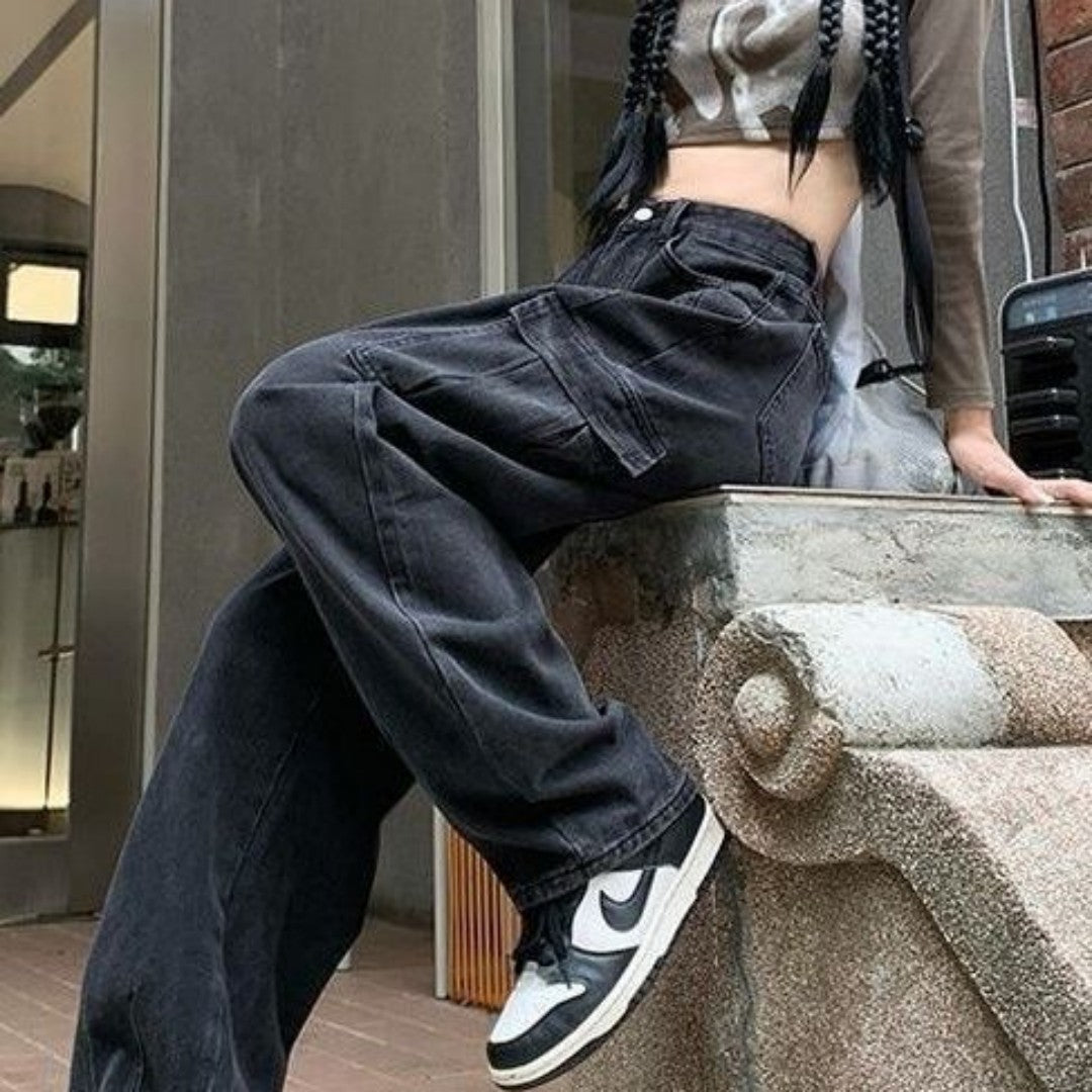 Tags : cotton workwear pants, high waist jeans, inelastic denim jeans, loose black trousers, street fashion denim, women's fashion jeans,