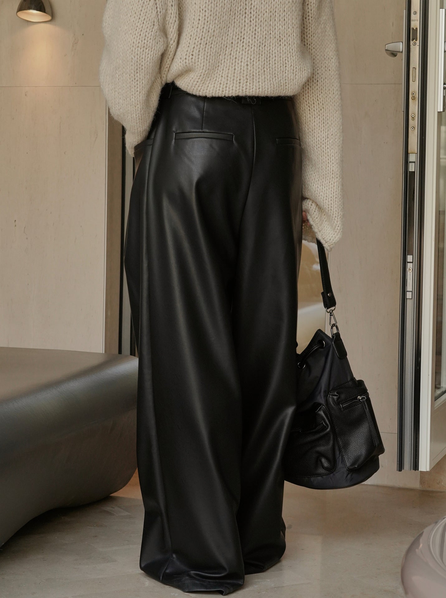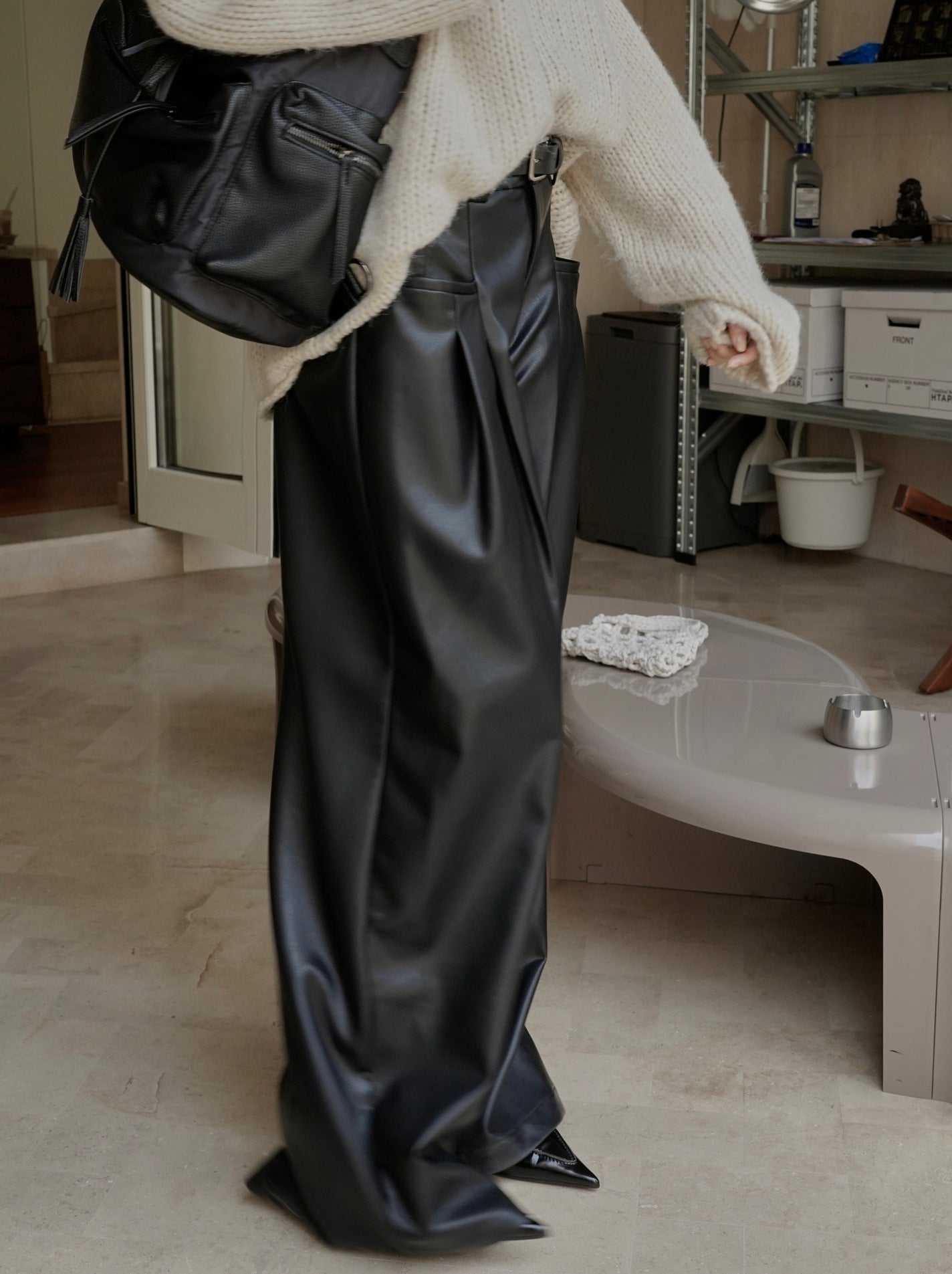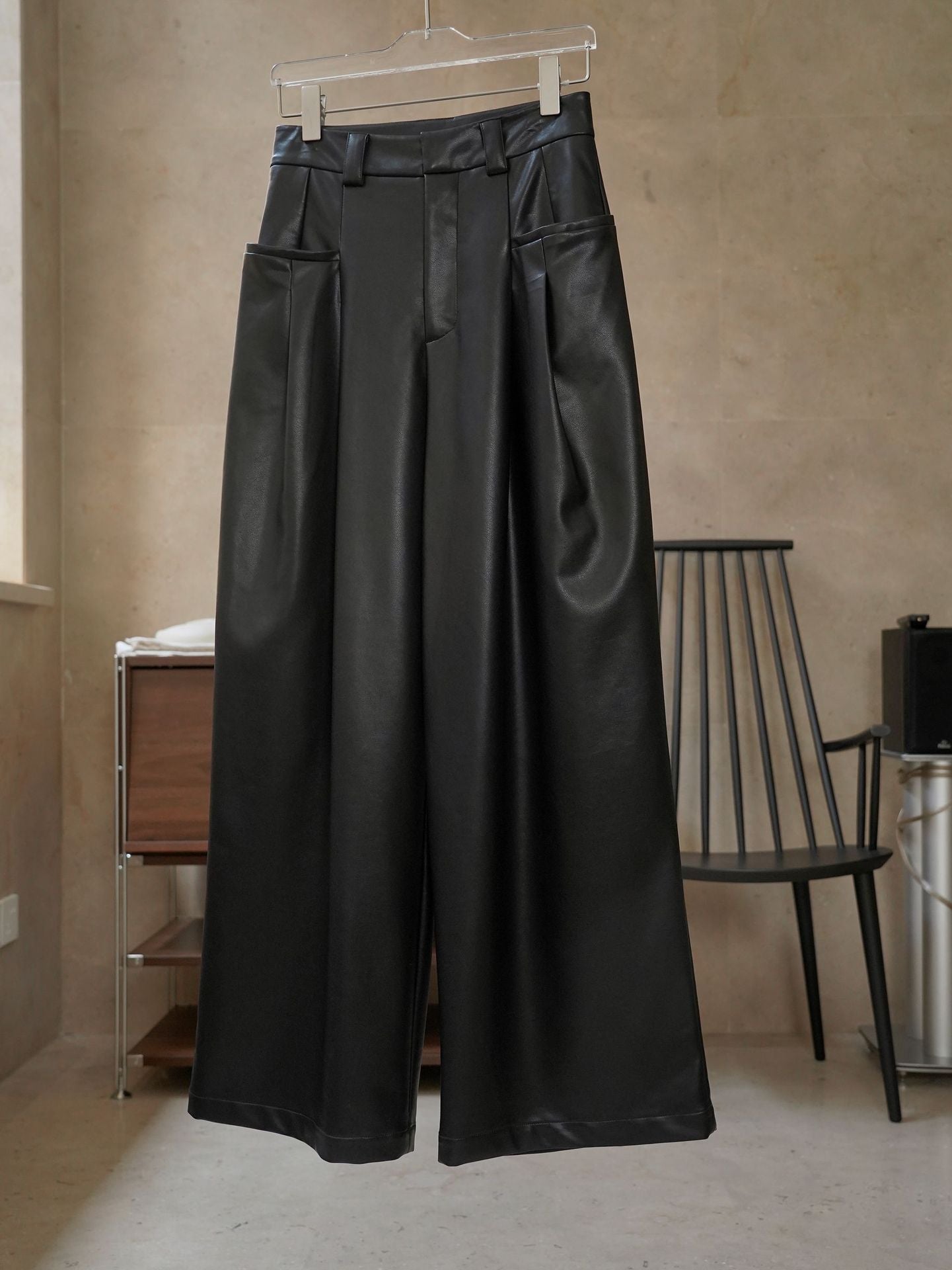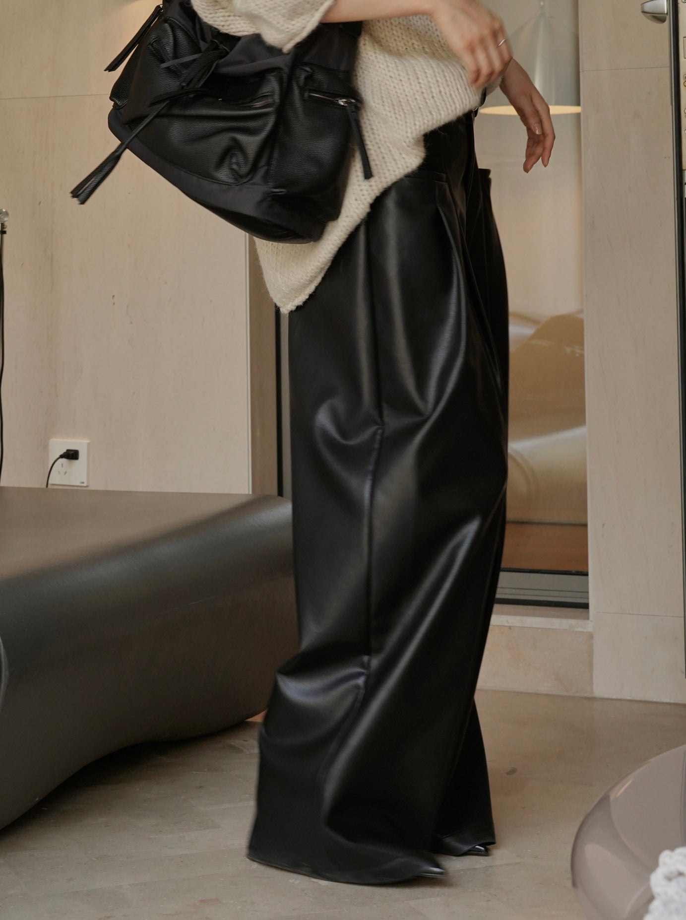 Women's High Waist PU Slim-fit Wide-leg Pants