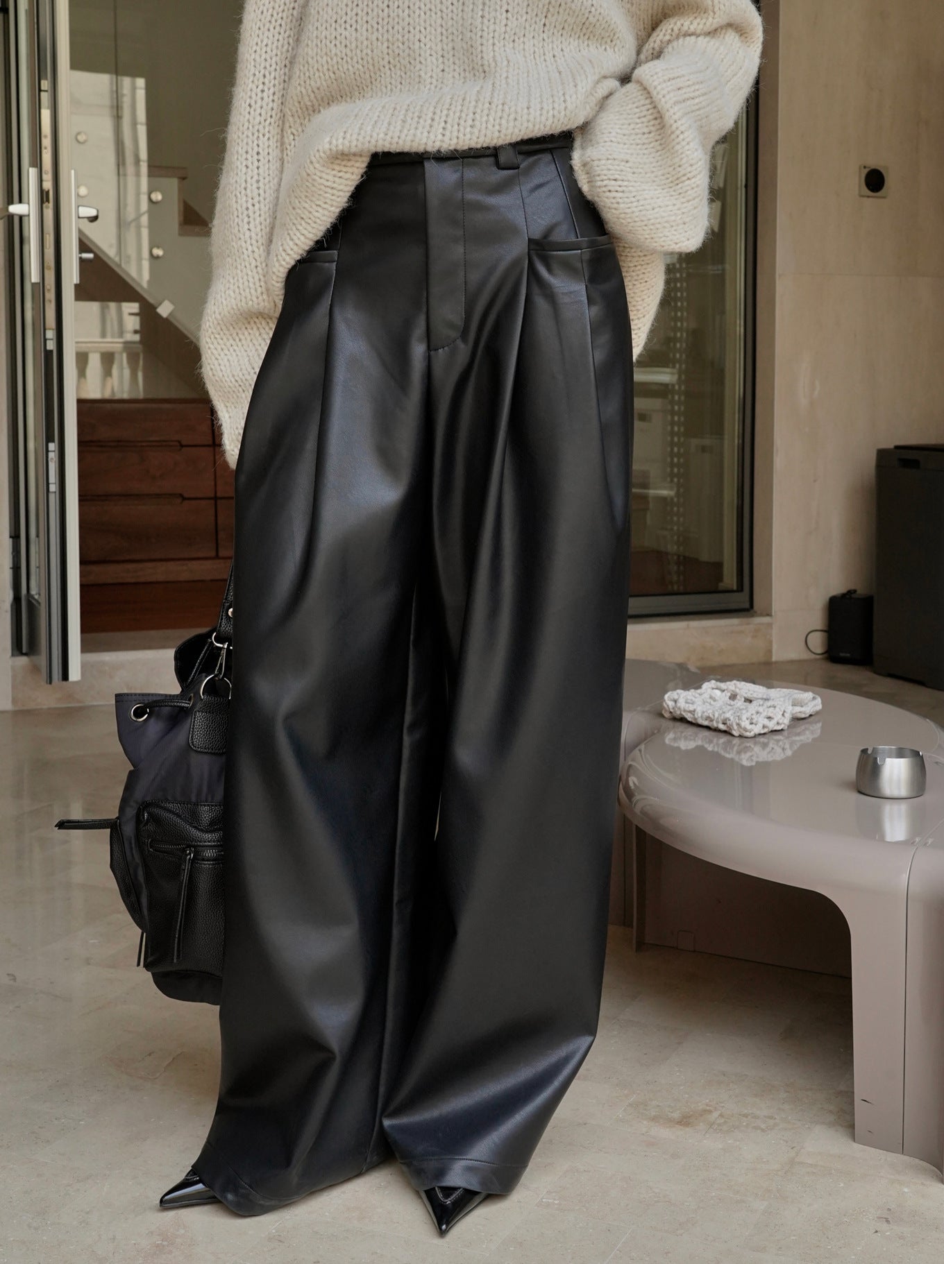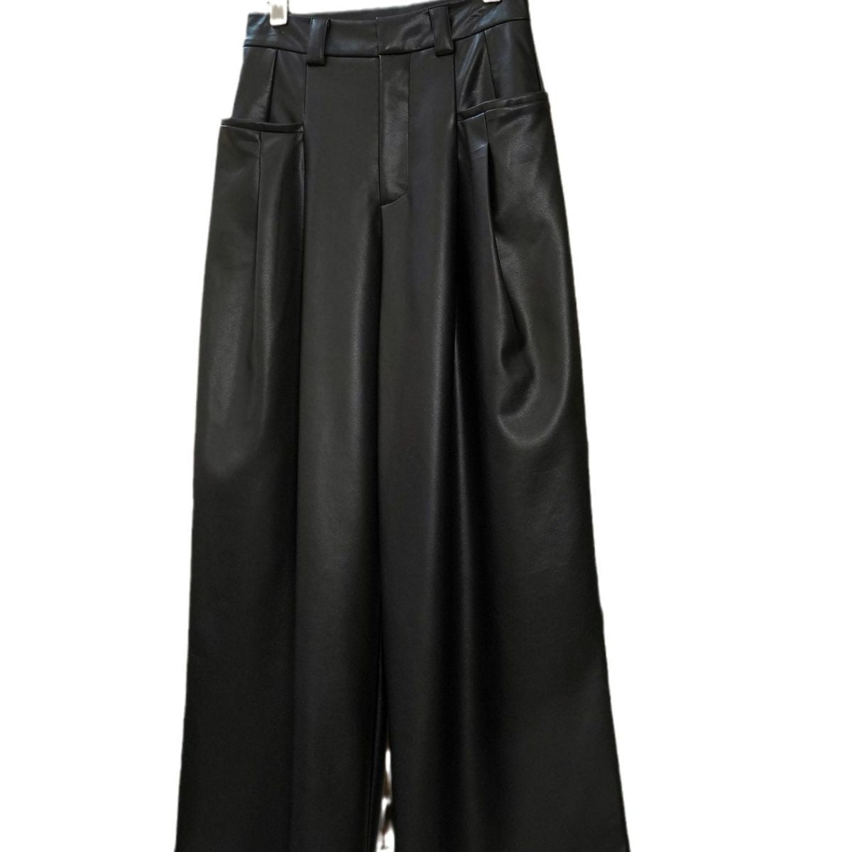 Product information: Fabric name: PU Main fabric composition: PU Main fabric component 2: polyester fiber Style: Wide leg pants Waist type: high waist Color: Black Size: S, M, L Main fabric composition content: 95% or...