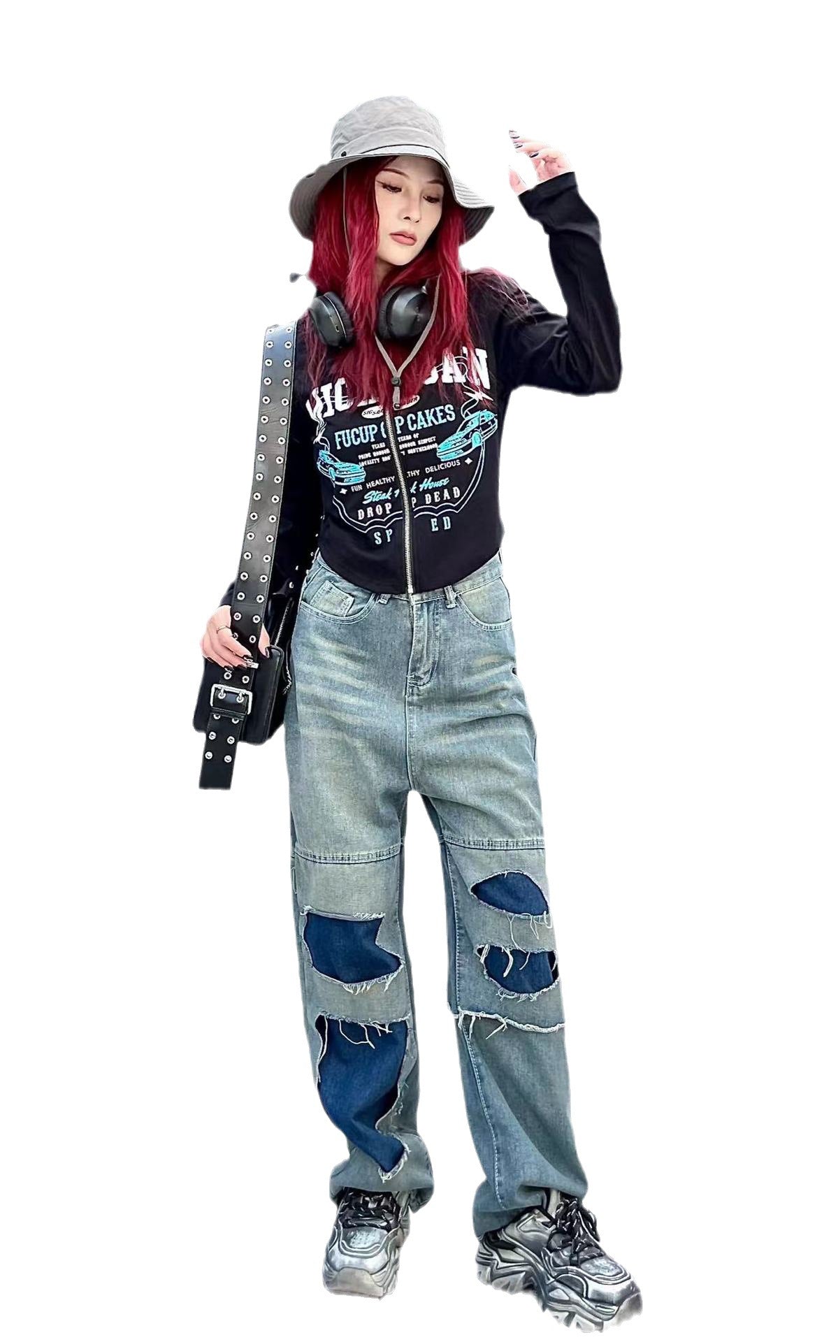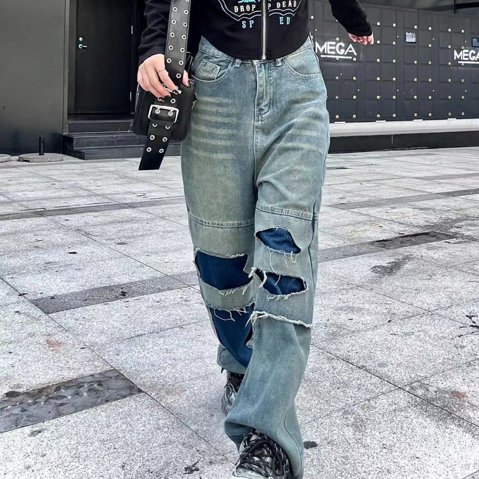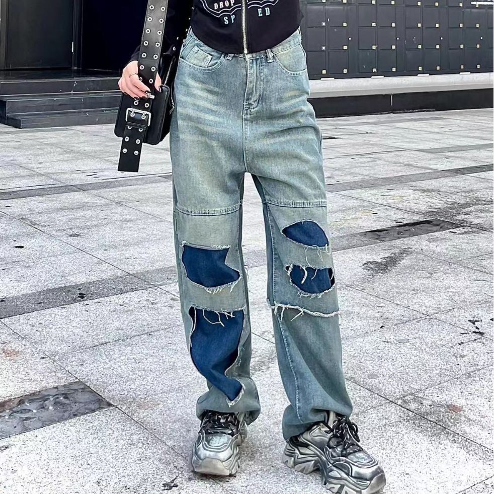Tags : asian size women's pants, blue slimming jeans, cotton straight-leg pants, inelastic trousers, ripped stitching jeans, women's high waist jeans,