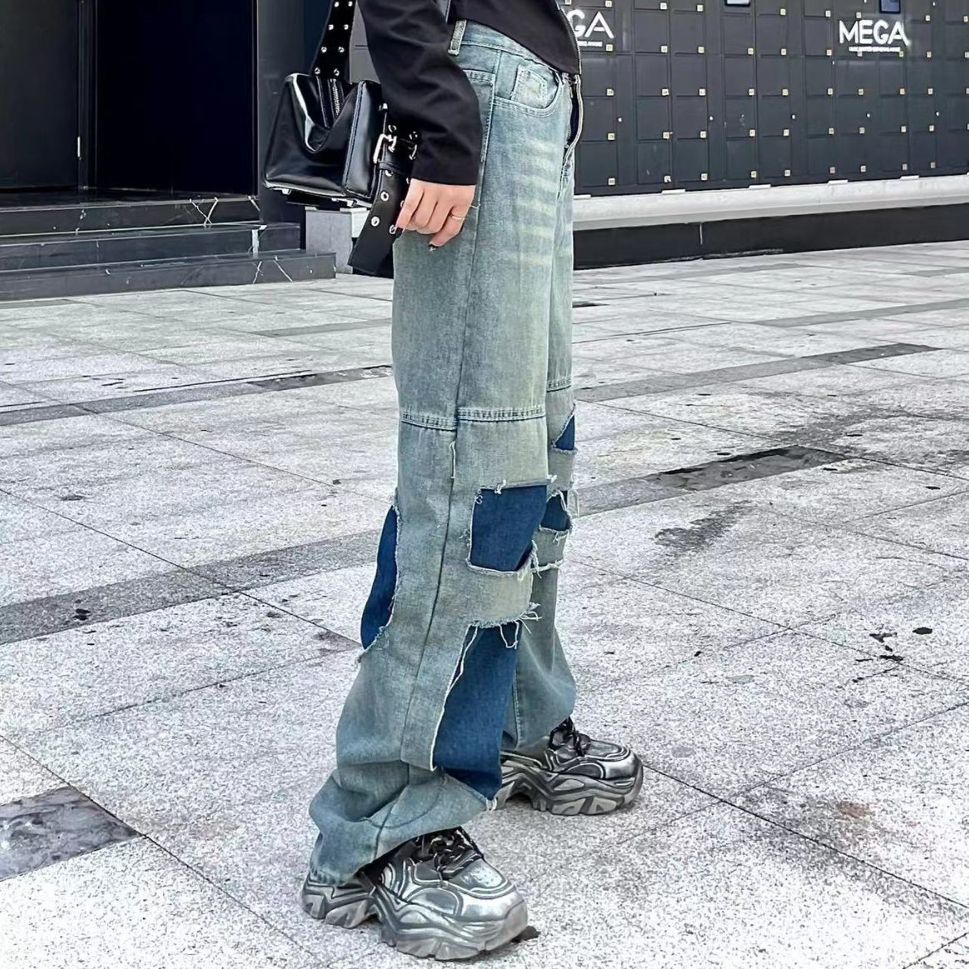 Women's Straight Pants Ripped Slimming Stitching Jeans